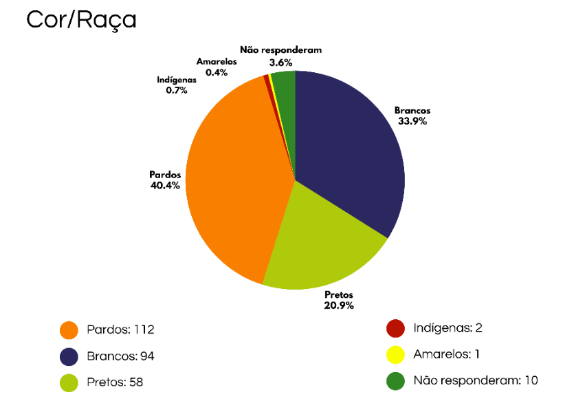 Outro ponto relevante diz respeito ao perfil racial/étnico, onde, conforme podemos notar nas informações dispostas no gráfico a seguir, 170 dos estudantes dos Polos do Aprendiz se autodeclaram pardos e pretos. O equivalente a 63% dos estudantes que responderam ao questionário. Seguindo a classificação oficial do IBGE, a maioria das crianças, adolescentes e jovens que estudam no Aprendiz Musical é constituída de pessoas negras. A expressiva presença de estudantes negros e negras no Aprendiz Musical está intimamente relacionado ao seu vínculo com a escola pública.