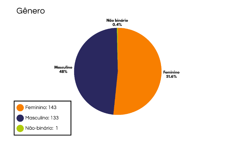 Conforme podemos notar figura onde é apresentada o gênero de estudantes dos Polos Aprendiz Musical, os estudantes dos Polos Aprendiz Musical, 143 são do gênero feminino, o que representa 51,62% do grupo. Já os do gênero masculino totalizam 133, equivalente a 48,o1% . Podemos dizer, inclusive, que presença das jovens no Aprendiz Musical acompanha distribuição percentual de gênero na cidade de Niterói, com ligeira maioria para feminino. Destacamos aqui o registro de 1 (0,36%) caso em que a pessoa se declarou “não binário”.