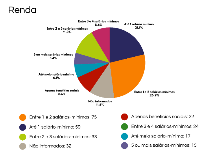 Os estudantes atendidos nos Polos com renda familiar de até 2 salários-mínimos compreendem sua maioria, pois representam 62%. As famílias que vivem com renda de até 1 salário-mínimo alcançam 35%, sendo o equivalente, em números absolutos, a 98 famílias. Apenas 5% das famílias nos Polos têm a renda mensal de 5 ou mais salários-mínimos.